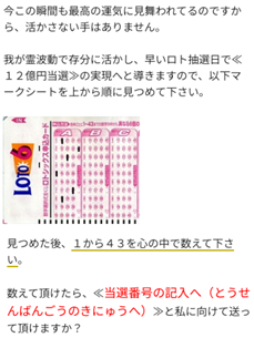 ≪購入した宝くじが一等を得られる≫私の気を授ければ抽選結果を操作して貴方に与えることができます。目の前に12億円当選機会は訪れているので、朝までにこちら行って下さい。200~300円分のくじ一枚で当選を与えます。